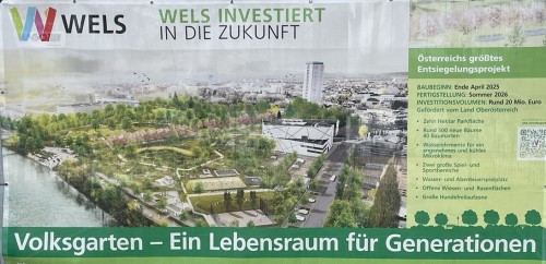 Ausgangspunkt für Landesgartenschau 2027, Dank der Bodenentsiegelung des bisherigen Messegeländes Ost kann der Volksgarten erweitert werden und erstreckt sich künftig bis zum Traunufer. Als grüne Oase im Herzen der Stadt verbindet er zukünftig Erholung, Natur und Aktivität für alle Generationen. Mit der Erweiterung erhält der Park seine historische Bedeutung als Bürgerpark zurück.